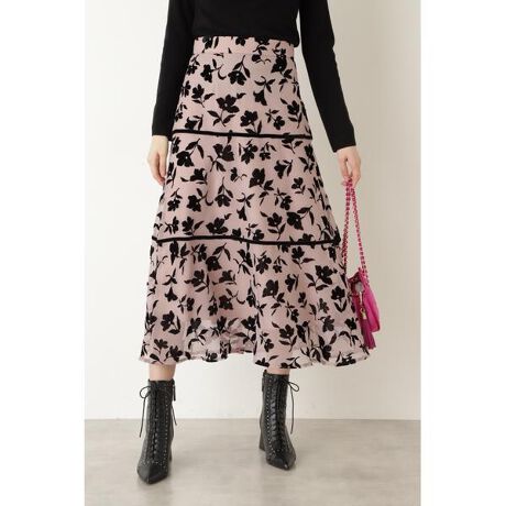 フラワーが浮き出した表情感のある素材で贅沢に仕上げたスカート落ち着きのあるバイカラーでフラワーモチーフに陰影を表現し、ティアードのように2段の切替をあしらったデザインです。腰まわりをすっきりさせて、裾にかけてゆるやかに広がる上品なシルエット、表の生地と裏地に少し差丈をつけることでブーツとも軽やかなバランスで着られます。ブラウスからニットまで相性良く、大人フェミニンな装いに。※後ろファスナー付き・裏地付き