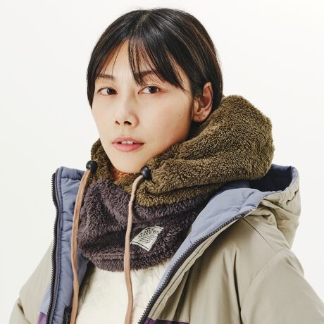 毛足の長いシャギーボアフリースを使ったフード付きネックウォーマーです。