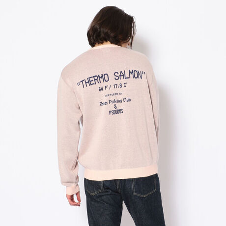 CHAOS FISHING CLUB(カオスフィッシングクラブ)とPSEUDOS(シュードス)のコラボレーションアイテム。ジャガード織で柄を表現したコットンニットです。フロントのグラフィックは、背面のロゴにあるように「THERMO SALMON」、サーモグラフィで見たサーモンを表現。CHAOS FISHING CLUBカオスフィッシングクラブ釣りとスケボーをこよなく愛する東京発の謎の集団。UKのDSMでの取り扱いで一気にその名を知らしめた、感度の高いスケーターをサポートしている純国産のアパレルブランド。”てきとうにやっちゃうよ?”