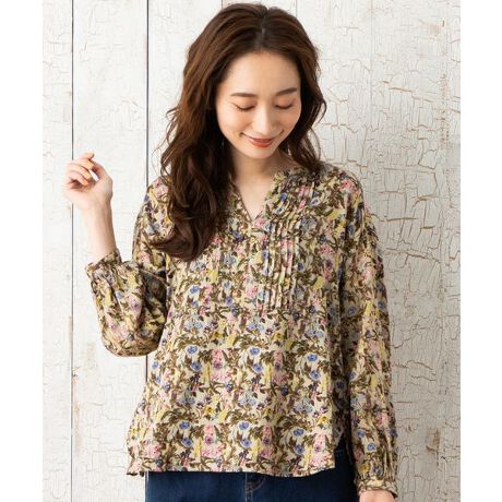カラフルなのに秋らしい印象を与えるフラワープリントのブラウス。