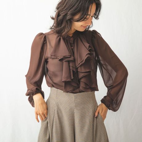 ボリュームのあるフリルをたっぷりと胸元へあしらった、フェミニンな雰囲気のブラウスです。肩や袖口にギャザーを施して、袖には膨らみ感を持たせました。胸元にはダーツを入れ、立体感のあるシルエットに。つややかなボタンも選んだこともポイント。ワンカラーで合わせやすいのも嬉しい。コーディネートを華やかに彩るアイテムです。