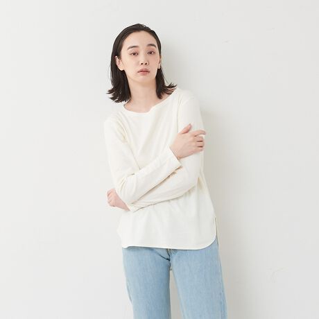 着まわしの効くベーシックデザインで、首元は程よい開き具合で抜け感がアップします。