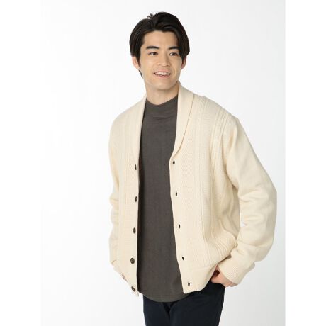 気軽に羽織れるショールカラーのニットカーディガンです。ボタンアップ仕様で、落ち着いた雰囲気に仕上げています。シーズンムードを盛り上げるアラン柄の編地が、秋冬スタイルにぴったりです。