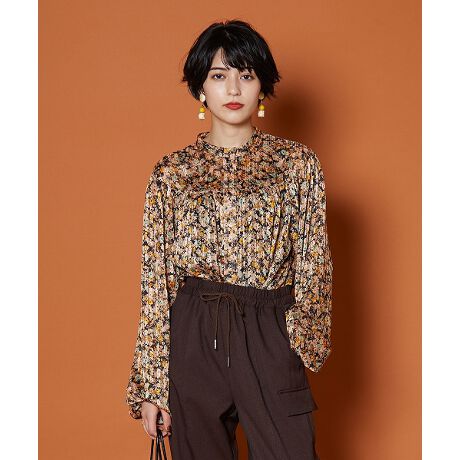 光沢感のある素材に色彩豊かなフラワープリントで華やかな雰囲気に仕上がりました。さりげないラメのストライププリントがアクセントになり上品さをプラスしてくれます。ギャザーでボリュームを出しつつも、ネックラインはスッキリとしたバンドカラーにしてバランス感の良い大人な仕上がりに。スリーブにも大胆なボリュームを持たせ、そのまま着用するだけでさまになる一着に仕上げました。袖口を捲ってパフスリーブのようにして着こなすのもおすすめ。