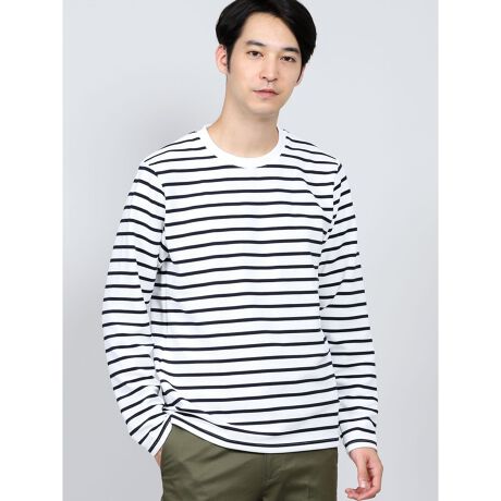 シンプルなボーダー柄のクルーネックプルオーバーです。カジュアル過ぎない、綺麗目なルックスに仕上げています。プライベートからビジネスカジュアルまでオンオフ兼用で大活躍します。
