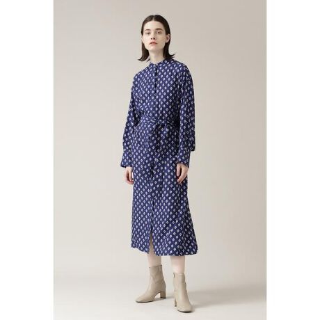 キャッチーな幾何ダイヤプリントがシーズンムード漂う、クラシックなシャツワンピースです。ポリエステルツイル素材を使用し、オリジナルプリントがやや立体的に乗るようにこだわりました。ソフトなタッチの素材感です。クラシックな雰囲気のスタンドネックのシャツワンピースになります。後ろ姿にアシンメトリーなラップデザインを入れて、印象的に仕上げました。ウエストベルト付きで、ウエストマークして着て頂くとスタイルアップ効果があります。