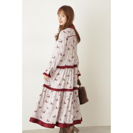 個性的なホースプリントを用いたロングワンピースデイリーに着やすいようシャツドレスのデザインに仕上げました。部分的に配色の効いた起毛サテンが、シルエットに季節感のあるメリハリをつけて、気品漂うデザインポイントを実現。一枚で着るだけでなく、ローゲージカーディガンをゆるっと羽織るスタイルもオススメです。