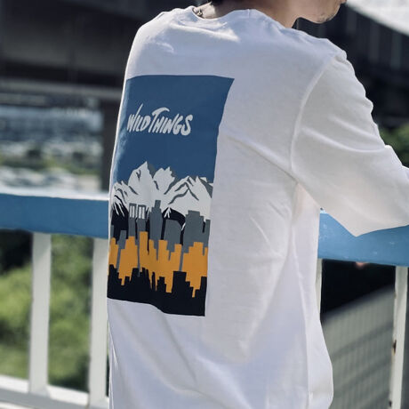 そんな同ブランドに別注をかけたロンTは、都会のビル群と山脈が共存するバックプリントが象徴的な1枚。