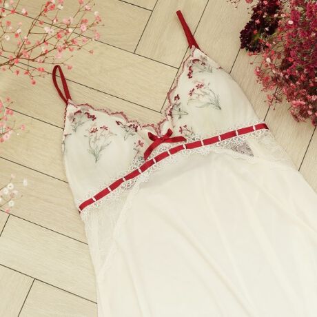 刺しゅうで作られたブーケは優しげな印象で、バスト部分の下にあしらわれたサテンテープはお花やストラップと同じカラーで、クラシカルな柄いきのケミカルレースに通すことでデザインのアクセントに。