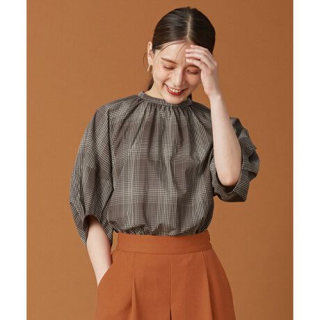 エニィファムの【洗える】ランタンスリーブチェック ブラウス。