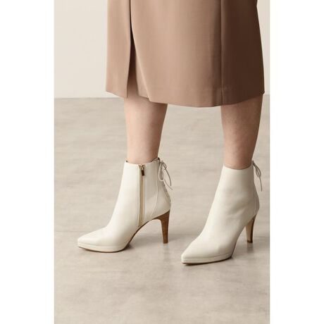 バックの編み上げレースがポイントのブーツ。後ろ姿をスタイリッシュに魅せてくれます。ポインテッドトゥで、前から見るとシンプルでシャープなデザインは、合わせる服を選びません。9センチ越えのヒールで足長効果抜群ですが、厚みのある底を使うことで、高低差が縮まり、安定感を持たせています。レースのリボンは点止めしており、歩いてもほどける心配がありません。ゴールドのサイドジップがラグジュアリー感をプラス。着脱もスムーズです。柔らかな風合いのエクリュと、シャープなブラックの2色展開。