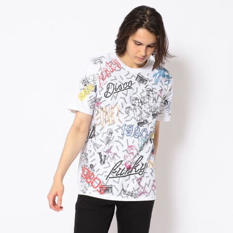 80年代をイメージしたイラストを総柄プリントしたTシャツ。