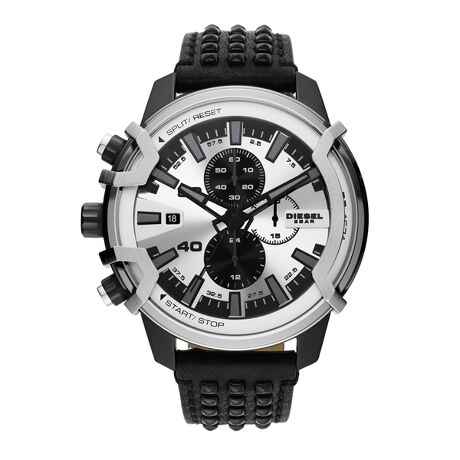48mm径ケースにクロノグラフムーブメントを搭載したGRIFFED ウォッチ。バーインデックスを配したシルバートーンのサンレイダイヤルに、ブラックのレザーストラップを組み合わせました。