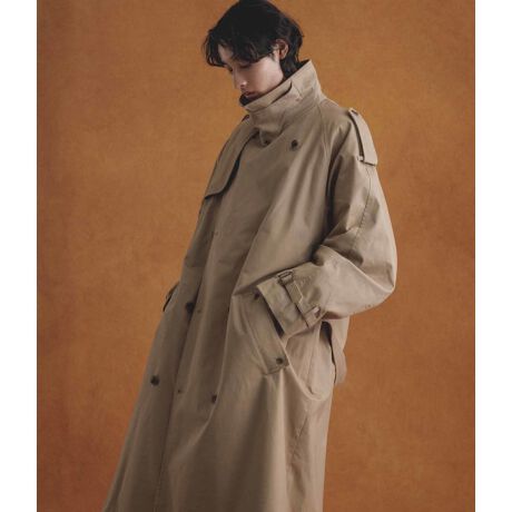現代的なリラックスした雰囲気を醸し、程良くオーバーサイズでバサッと羽織っていただきたいトレンチコートです。クラシックなトレンチコートのディテールを取り入れていますので、トラッドな着こなしにもソツなくハマリます。着回しの自由度が高いアイテムに仕上げており、ベルトで締めてブラウジングさせたり、 フロントを閉じてチンストラップを閉めて着用することも可能。長めの着丈設定なので、これ1着でコーディネートが決まります。腰に付いたベルトは、やや高めの位置に設定しており、スタイルアップの補正効果も抜群。裏地もしっかり付いているので、秋冬春の3シーズンで大活躍間違いなしの1着です。