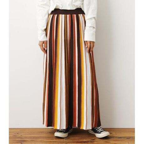 スタイリングのポイントになるニットスカート。メンズライクなアイテムと合わせるのがRODEO流ガーリースタイル。プリントカラーとマルチカラーの色味を合わせるとお洒落なカラーコーディネートも楽しむ事ができます。