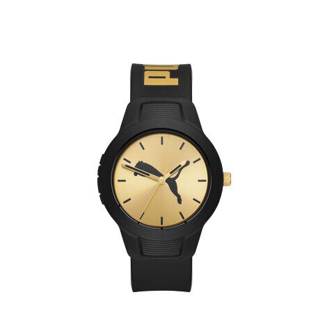 バーインデックスを配したゴールドトーンのサンレイダイヤルに、ブラックのポリウレタンストラップを組み合わせました。
