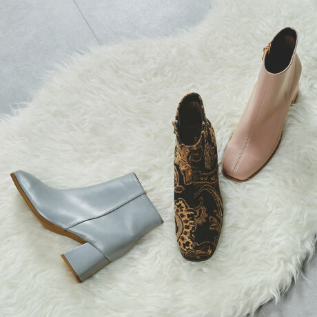 変形ヒールとジップの金具でさりげないアクセントをつけ、秋冬のコーディネートを一気に明るい気分にさせてくれる今季注目の1足。