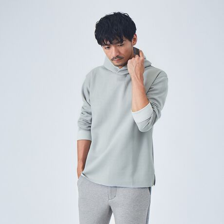 着回ししやすいプルオーバータイプでスラックスやカジュアルパンツなどどんなコーディネートにも合わせやすいパーカーです。アウターのインナーとしてはもちろん、一枚で着用してもお洒落に着こなせます。