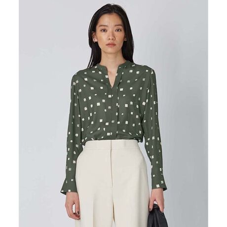 ■デザイン品の良さが際立つV開きの襟元はクリーンな印象の中にも抜け感をプラスしてくれます。オフィスシーンでもシーズンレスに女性らしい印象で重宝する一枚着ブラウスです。一枚着はもちろん、ジャケットのインナーとしても着用可能。オフの日はデニムなどカジュアルなボトム合わせで着崩し着回して幅広く活躍します。ブラックスクエアドット柄(405色)、カーキスクエアドット柄(454色)、ライトグレースクエアドット柄(403色)が新しく追加となりました。