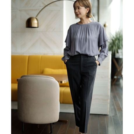 ■デザインすっきりとしたシルエットで美脚見えが叶うテーパードパンツです。主張しすぎない落ち着いたチェックなので、通勤などのきちんとさせたいコーディネートにも取り入れやすい柄感です。今年は裾幅と股ぐりを少し出し、ヒップと足のラインをひろい過ぎないシルエットに修正しています。前身頃のセンタークリース加工でセンタープレスをキープできる優秀パンツです。