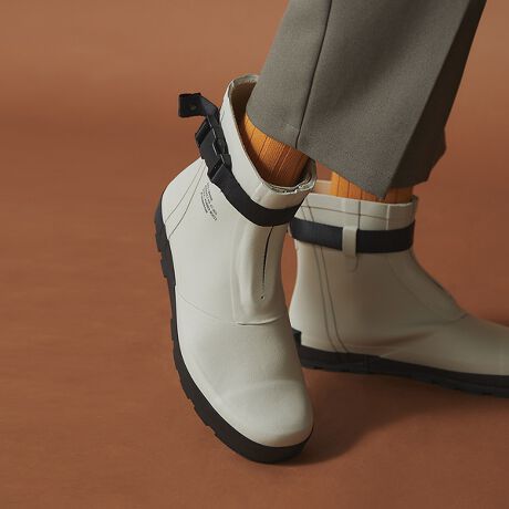 多用途の作業用ゴム長靴をデイリーユースに。バックル仕様にすることで着脱の容易さは保ちつつ、フィット性を高めるシルエットに改良。