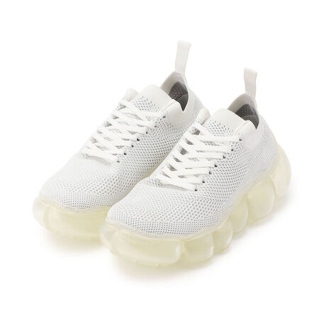 宝石を思わせる透明な球体で作られた厚底のクリアソールは、履いている人や見る人の意識を足元に向けさせる。それぞれの球体は足の動きに合わせて柔らかく動くように設計されており、独特な歩き心地とグリップ感があります。また、履いた時に最適なクッション性を感じられるように素材の柔軟性をコントロールすることで、手で触った時には感じられないような、フワフワと浮いているような感覚を演出してくれます。特徴的な形状のアウトソールとは相反するようにシンプルに仕上げたニットアッパーは幅広いファッションと合わせやすいようにあえてミニマルに仕上げられています。アッパーの一部はメッシュ構造になっていて、ソックスのカラーがデザインに反映されています。ヒール部分の高さはどのサイズも約5cm。ボリュームがありながらも透明にすることで見た目の重さを軽減させているデザインです。grounds / グラウンズMIKIO SAKABEを手がけるデザイナー坂部三樹郎が監修するフットウェアブランド。「人間と重力(地球)の関係に変化をもたらすこと」「人間と重力(地球)の接点であるアウトソールと地面を中心とした人間づくり」をテーマに、ボリュームのある特徴的なアウトソールを組み合わせたフットウェアを発表しています。