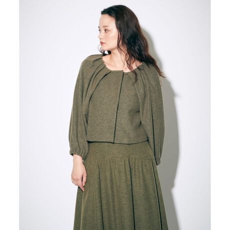 一枚でおしゃれに整う、構築的なルックスが魅力のトップス。杢調の圧縮ブークレージャージ素材を使用しタックスリーブで表現した、360度どの角度から見ても愛らしく美しいシルエットが魅力の一枚です。非常に軽くて肌触りが良い、着心地が良い点も魅力。前を閉じてトップスとして着るのはもちろんの事、開けて中にニットを添えたカーディガン風に羽織った着回し、さらにセットアップで着用すればワンピースとして楽しめるスカート合わせもおすすめです。一枚あればコーディネートの幅が広がる万能アイテムです。