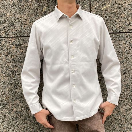 薄いポリエステルのスムース素材を2枚貼り合わせ、表面を微起毛加工し、バイアス状のランダムなストライプ柄をエンボスプリントを施したオリジナル素材です。プリッとした張り感と微起毛のソフトな風合いが特徴的で、起毛をつぶす様にプリントを入れているのでさりげない柄感が上品です。衿先にワイヤーを入れたレギュラーカラーで、サイズ感も細過ぎず、素材の風合いを感じる様に着やすく仕上げています。同色のストレッチ裏地を採用してパーツごとの生地厚を調整しています。カラー19グレーは薄いライトグレーです。白だとプリントも目立たず、生地の風合いもわかりづらいで、あえて白に近い薄い色にしています。