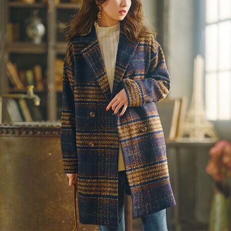 多色使いの大柄チェックが大人っぽい、ダブルデザインのコート。凹凸感のあるツイード素材でトレンド感と上品さをプラス。ボトムを選ばない絶妙なミディ丈と、程よいゆるシルエットで着やすさも◎。
