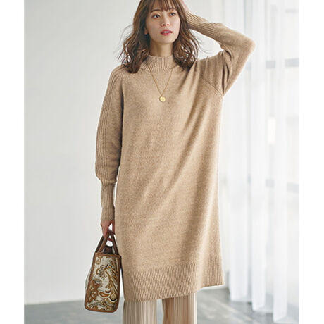 ふんわり、もっちりとしたマシュマロみたいに気持ち良い肌触り!シンプルなニットワンピは、サイドのリブ切替ですっきり細見え効果も。スキニーパンツやゆるパンツに似合う丈感で着回し力◎!