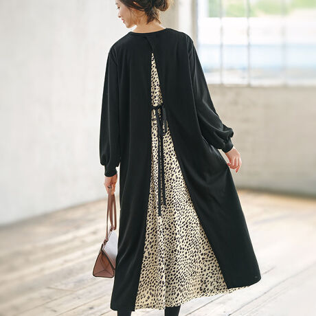 バックの大胆なスリットから華やかなオーラを放つ、レイヤード風デザインのカットソーワンピース。程良くゆとりを持たせたシルエット&ロング丈で、すっきりとした細見え効果も期待!