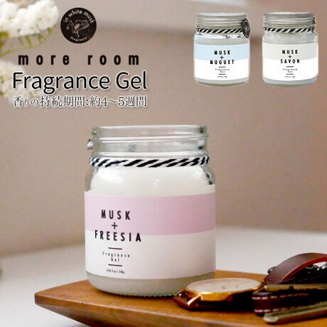 ホワイトムスクにmore(プラス)した香り♪more room(モアルーム)のフレグランスジェルが新登場!more room(モアルーム)は、「こころをプラスに、暮らしをプラスに」をコンセプトにした、シンプルで優しく香るフレグランスシリーズ。場所を選ばず飾りやすい、置き型タイプのフレグランスジェル。植物抽出成分の消臭剤配合で、生活の気になるニオイをカット!ジェルタイプだから、オイルのようにこぼれる心配がなく安心。フタをあけるだけで、やさしい香りがふわっと広がる♪玄関先やトイレ、洗面台、寝室など、幅広くお使いいただけるアイテム。ころんとしたフォルムのガラス容器にモノトーンの紐がアクセント♪おしゃれな見た目で、贈り物にもおすすめ。ムスク/フリージア…フリージアは、甘く華やかな香りとして、香水にもたくさん使用される人気の香り。ホワイトムスクの優しい調香に、甘さ・爽やかさ・みずみずしさ・落ち着いた上品さをプラスした、奥行のある香り。ムスク/ミュゲ…みずみずしく可憐で清楚な香りが人気のすずらん。まるでお花屋さんにいるようなフレッシュな香りを、ホワイトムスクのサボンが優しく包み込む、ウォーターリーで透明感のある香り。ムスク/サボン… ホワイトムスクの優しさと、洗い立てのリネンのようなサボンが混じり合う心地よさ。フレッシュな果実とすっきりとした花々の清々しい香り。香りの持続期間:約4〜5週間(※香りの持続期間は、置き場所により異なります)