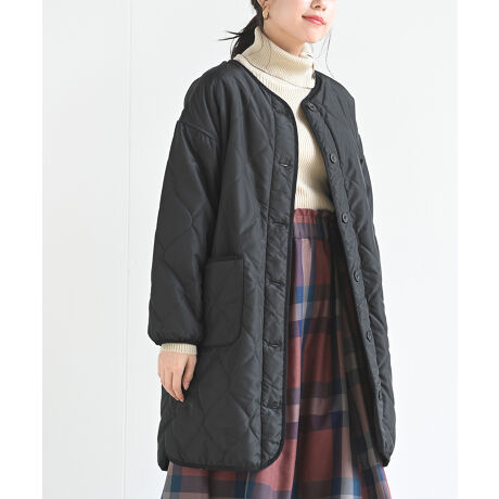 ゆったりデザインで今年らしく・・・あったかキルティングジャケットコート。今年らしい旬のアウター、キルティングジャケット。ベーシックなデザインながらゆったりとしたサイジングで今年らしさを出しました。薄手で軽量なのに暖かいストレスフリーなアウター。裏側はフリースになっていて保温性もある機能的にも優れたアイテムです。シンプルなノーカラーは合わせやすくカジュアルからきれいめまで幅広く活躍します。丈感もちょうどよく、パンツでもスカートでもバランスのいいコーデに♪ 裏フリース 伸縮性なし 中厚 前開きボタン留め サイドポケットあり 洗濯:洗濯機使用可