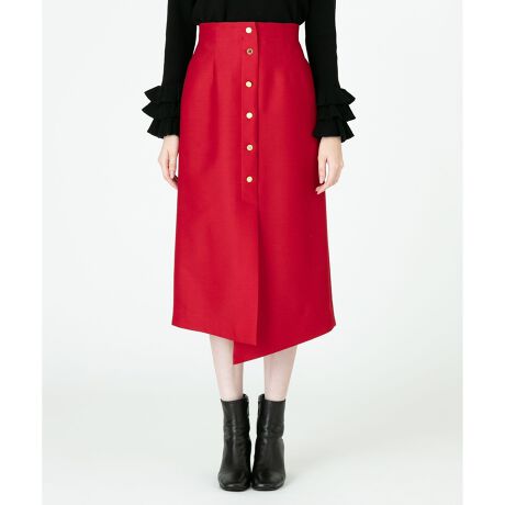 アシンメトリーなヘムラインとフロントボタンがアクセントになった、ちょっぴりレトロな雰囲気ただようスカートです。ウール×シルクのブレンド素材も贅沢な穿き心地を叶える好ディテール。コーディネートのニュアンスアップにGETしておきたいアイテムです。