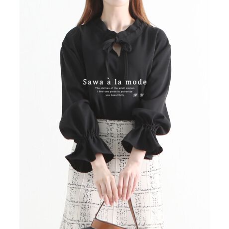 【ブラウス】トップス シャツ 黒 ブラック 長袖 リボン ハイネック パフスリーブ フェミニン 秋服