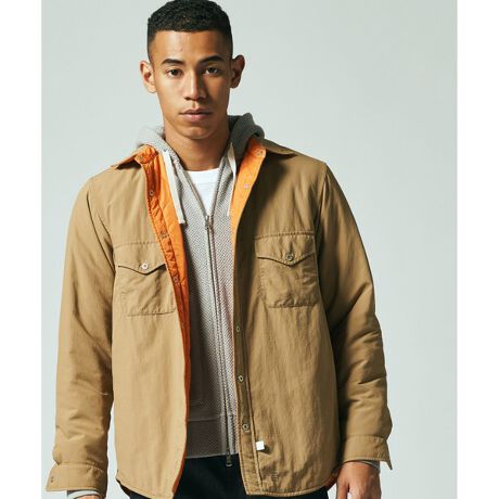 Jプレスのナイロン×中綿キルティング リバシャツ。