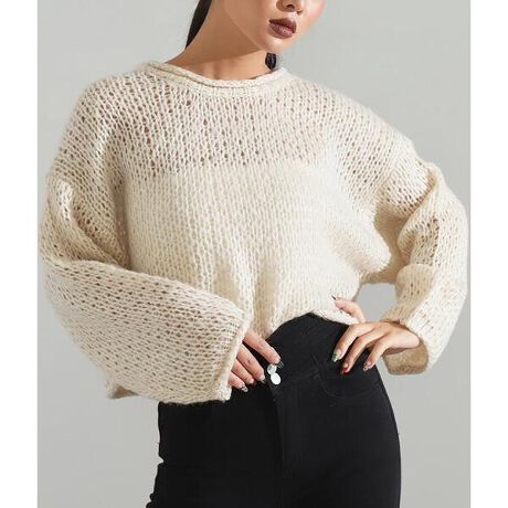 ざっくりとした編み地がリラクシーなムードを演出するニット。