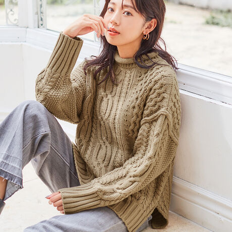 立体感のある大きいケーブル柄のニット。様々な編柄をmixさせたデザインでお洒落な印象に。