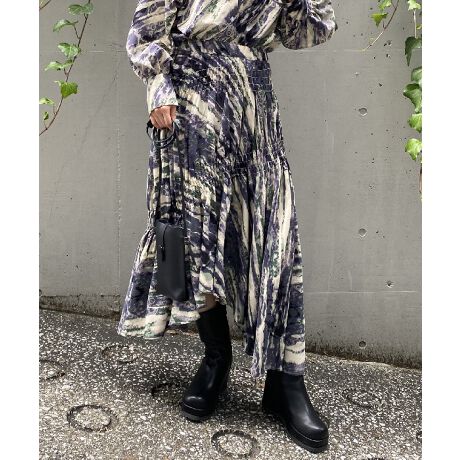 アートな雰囲気を醸し出す地層柄アシメスカートアートな雰囲気を醸し出す総柄のスカートは、アシンメトリーなシャーリングやヘムラインが大人な印象を与えつつ、着こなしの幅を広げる主役級アイテムに仕上げました◎同柄のブラウス(PB1178)を合わせてのワンピース風な着こなしもオススメです◎ 伸縮性:あり 透け感:なし
