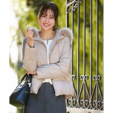 ダウン90%で暖かい!ファーの取り外しが可能な2WAYショートダウン■デザインフロントファスナー開きデザインのフードファー付きショートダウン。ファスナー開き部分には艶のあるグログラン調テープを施し、デザイン性とファスナー開閉時の布噛み防止機能を兼ね備えています。前丈は少し短めにして、ボトムスと合わせた時にバランスよく決まるデザインに。また後丈は少し長めでヒップ周りまでカバーするデザインなので、腰周りをしっかりと温めてくれます。ポケット口のゴールドポイントやフォックスファーでカジュアルになりすぎず、any SiSらしいエレガントな印象に仕上げました。■素材セミマットの上品な光沢感と僅かなピーチタッチで、カジュアルアイテムとの相性も良いタフタ素材を使用しています。ダウン90%でフィルパワーの高い上質なものを使用しているので、軽くて非常に暖かいのが特徴です。撥水性があるので軽い雨水をはじきやすいのもポイントです。ポケット部分の袋布には起毛スレキを使用して、寒い時期に嬉しい仕様にしています。ご家庭の洗濯機で洗えるお手入れのしやすさも魅力です。※商品画像はサンプルを使用しているため、色味やサイズ等の仕様に変更がある場合がございますので、予めご了承ください。#anySiS #エニィシス #エニシス#レディース #アウター #ショートダウン #ダウン #撥水 #きれいめ #上品 #きれいめコーデ #きれいめスタイル #カジュアル #カジュアルスタイル #カジュアルコーデ #休日コーデ #洗える #ウォッシャブル #イージーケア