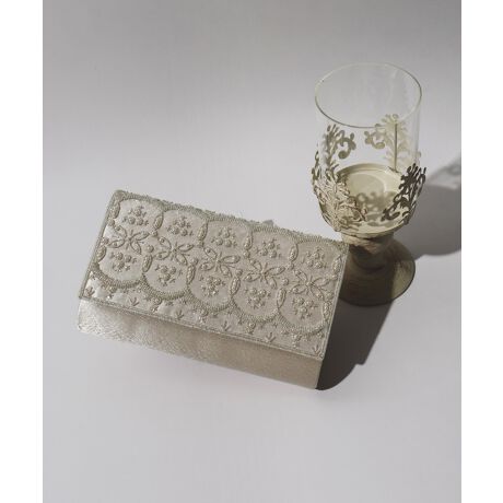 きらめくサテンの生地にフェイクパールとビーズで刺繍を。