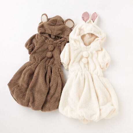 ハロウィンシーズンに活躍しそうな変身ワンピースです。カラーによってうさぎ、くまの2バージョンを展開しているので要チェック♪ パフの袖口やバルーンシルエットスカートなど、女の子が大好きな要素が散りばめられています。後ろ姿をキュートに印象づけるお尻のしっぽもポイント。内側にはお名前を記入できるタグつきです。【おすすめの着用時期は冬シーズン】【透け感】透けない※アイボリーで確認【生地の厚さ】普通【伸縮性】あり【裏地】あり※スカート部分のみ【ポケット】なし【アジャスター】なし