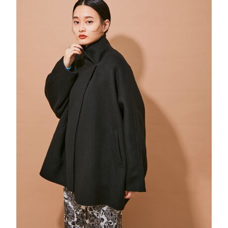 襟元のホックを留めてスタンドカラーとして着用したり、ホックを外しつつ少し襟を抜いてルーズに着用したりと、大きめの襟が顔まわりを華やかにしてくれるリバー仕立てのショートコート。ゆったりとしたドルマン型のシルエットなのでボリュームのあるニットの上からでも着用しやすく、たっぷりとしたフォルムも素敵な一着。