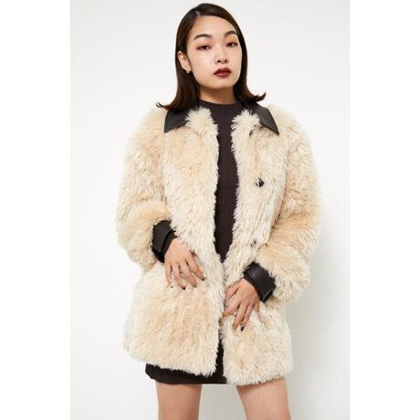 フェイクレザーをドッキングしたボアファーコート。フェミニンな印象のふんわりとしたボアにシャープなフェイクレザーを襟・袖・ポケット口に付け、マニッシュな要素をプラス。カジュアルにもフェミニンにも着用できるアウターです。