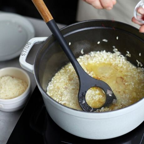 リゾット作りや、炒めたり、粘度のあるものを混ぜるのに最適。穴のおかげで、軽く、食材がつきにくいです。
