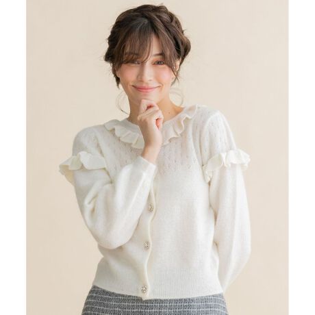 ■デザイン冬に咲く華憐な花々のブーケをイメージしたHOLIDAYのコレクション。ジュエル釦の輝きが放つ煌めきは、ホリデーシーズンの高揚感を表現しました。ハンドメイドニットのようなアイレットのデザイン、甘いフリルディティールは、優しくぬくもりのあるデザインです。