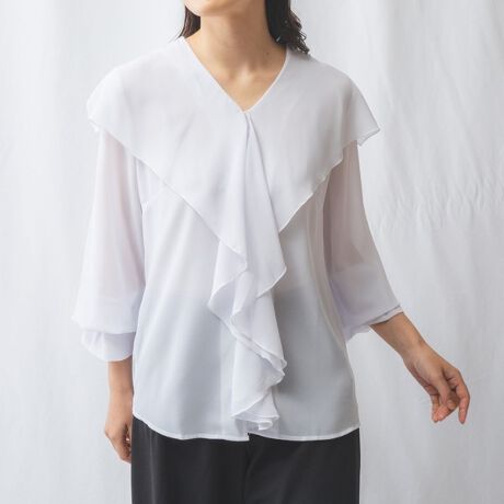 襟元から前立てにかけてたっぷりとフリルをあしらった、華やかな佇まいの長袖ブラウスです。襟の幅をしっかり取っていて、大きく広げてケープのように見せたり、クシュッと寄せてニュアンスを出したり、手軽なアレンジを楽しむことができます。シアーな質感のシフォン素材を使用していて、エレガントな仕上がりです。薄手なので、シーズンレスで着用できます。