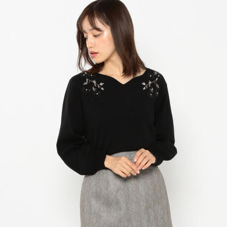 衿元にオーガンジーとビーズ装飾をあしらったレディライクなニットです。