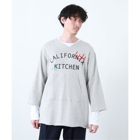 割烹着といえば、和な雰囲気で、料理をするときに着るイメージがありますが、スウェットの素材感とロゴプリント、「UH」と「kiki」のステッチが入ることで、普段使いもできるデザインに。