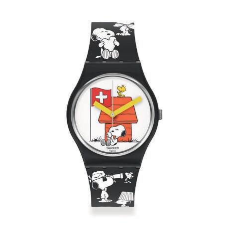 ホワイトの文字盤にはスヌーピーと小屋の上のスイス国旗のプリント。